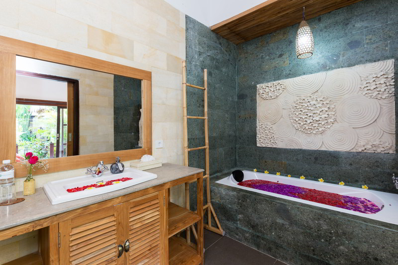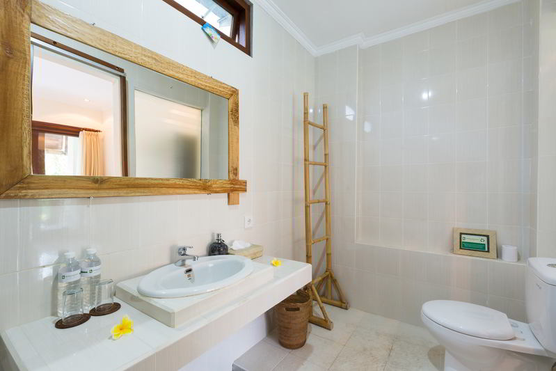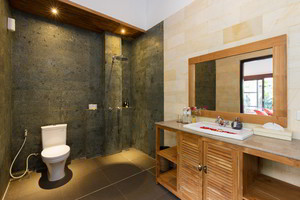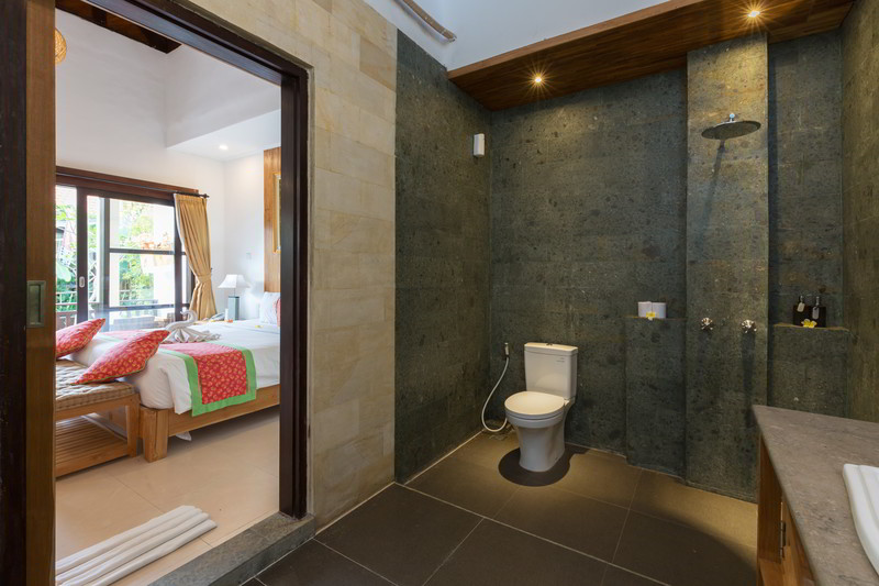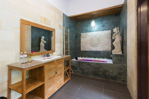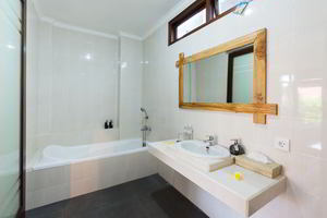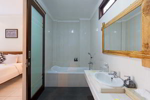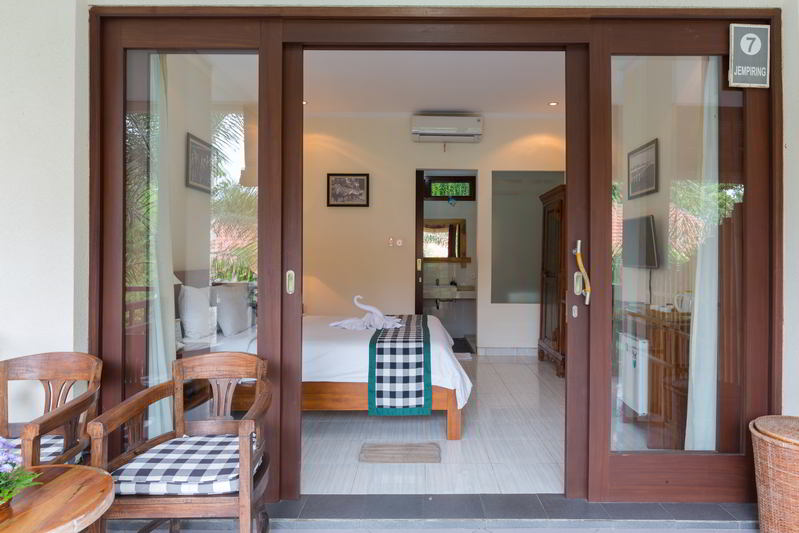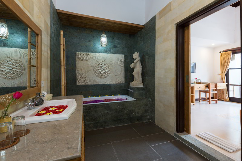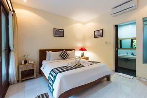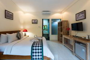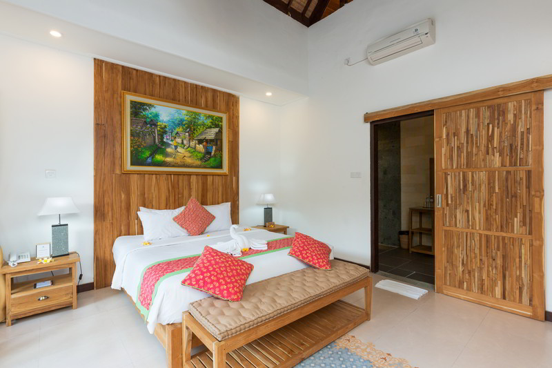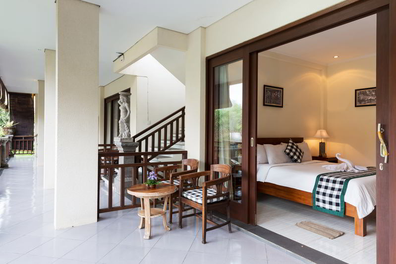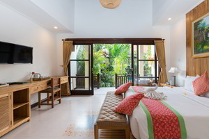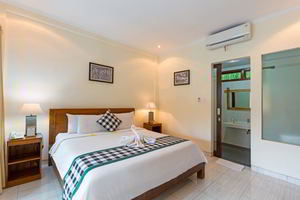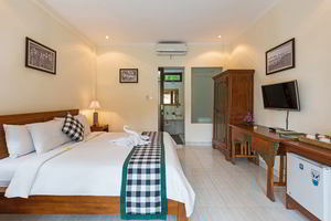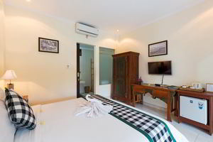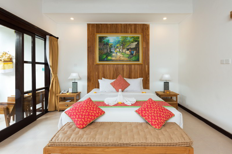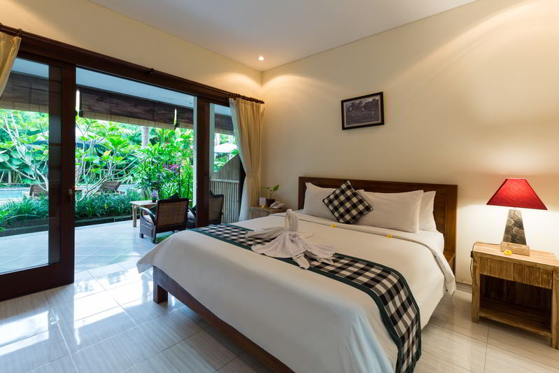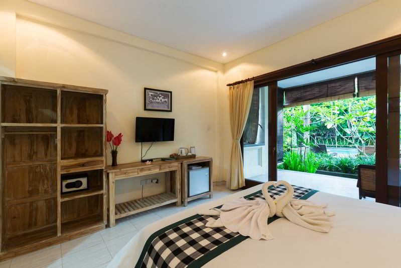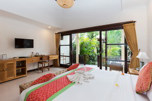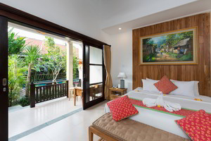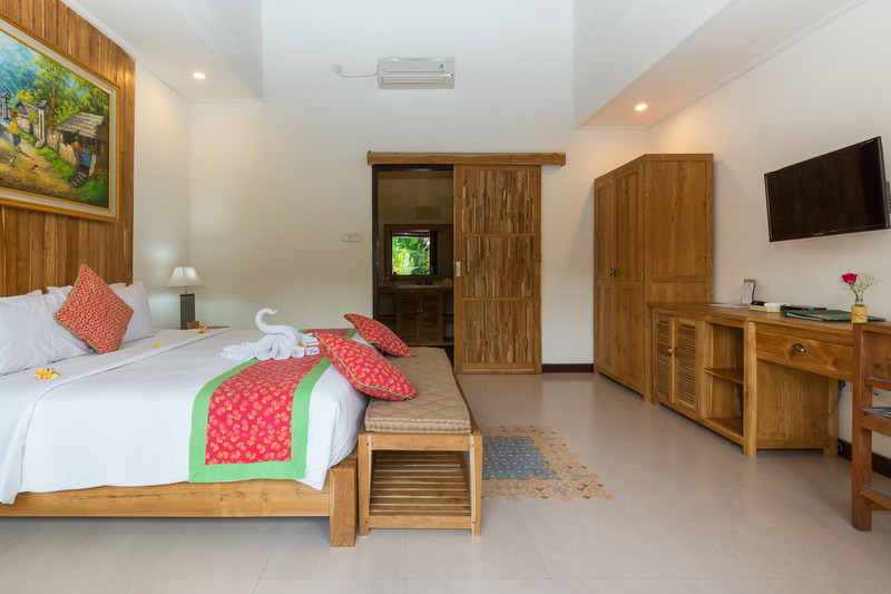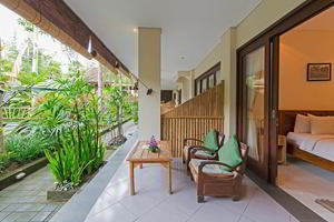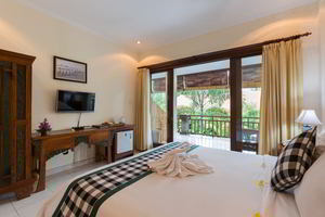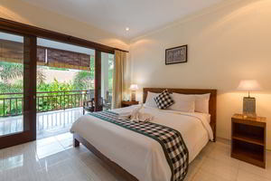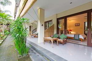 4 Deluxe rooms with total space of 32 sqm2 all completed with King size bed and well furnished with combination Balinese, antique and modern touch designed in higher level to get wider view of surrounding garden with spacius terace with thier coffee table and chair. The 2 adjacent room is suitable for family.
